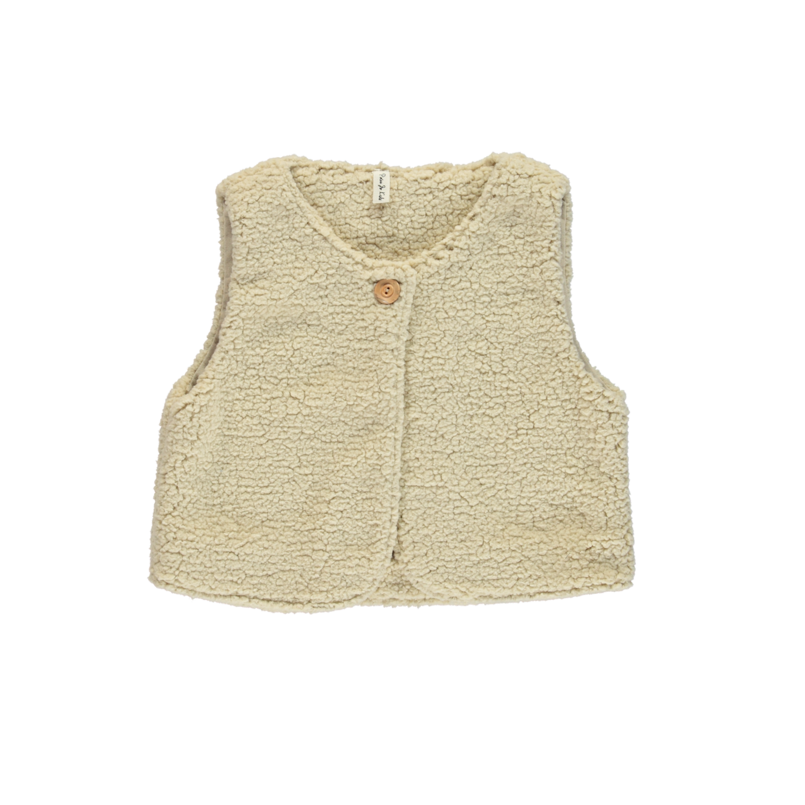 Casual fine vest for girls. Sleeveless, round neck, olive wood button closure. Inner lining in organic cream jersey. Made in sherpa (fake fur). Colors: maroon or ecru.